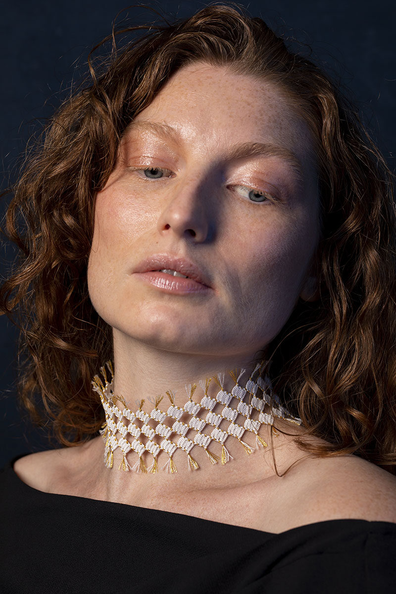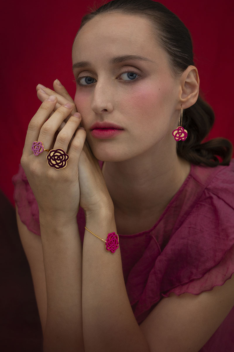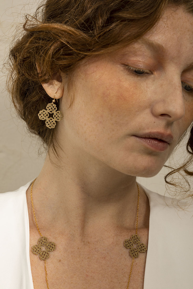 Les bijoux Koko sont réalisés en frivolité, technique de dentelle ancienne constituée d’une suite de nœuds, patiemment réalisés à l’aide d’un fil de coton très fin et d’une navette. Très peu représentée en France, j’ai à cœur de la faire découvrir à travers des créations en phase avec notre époque.