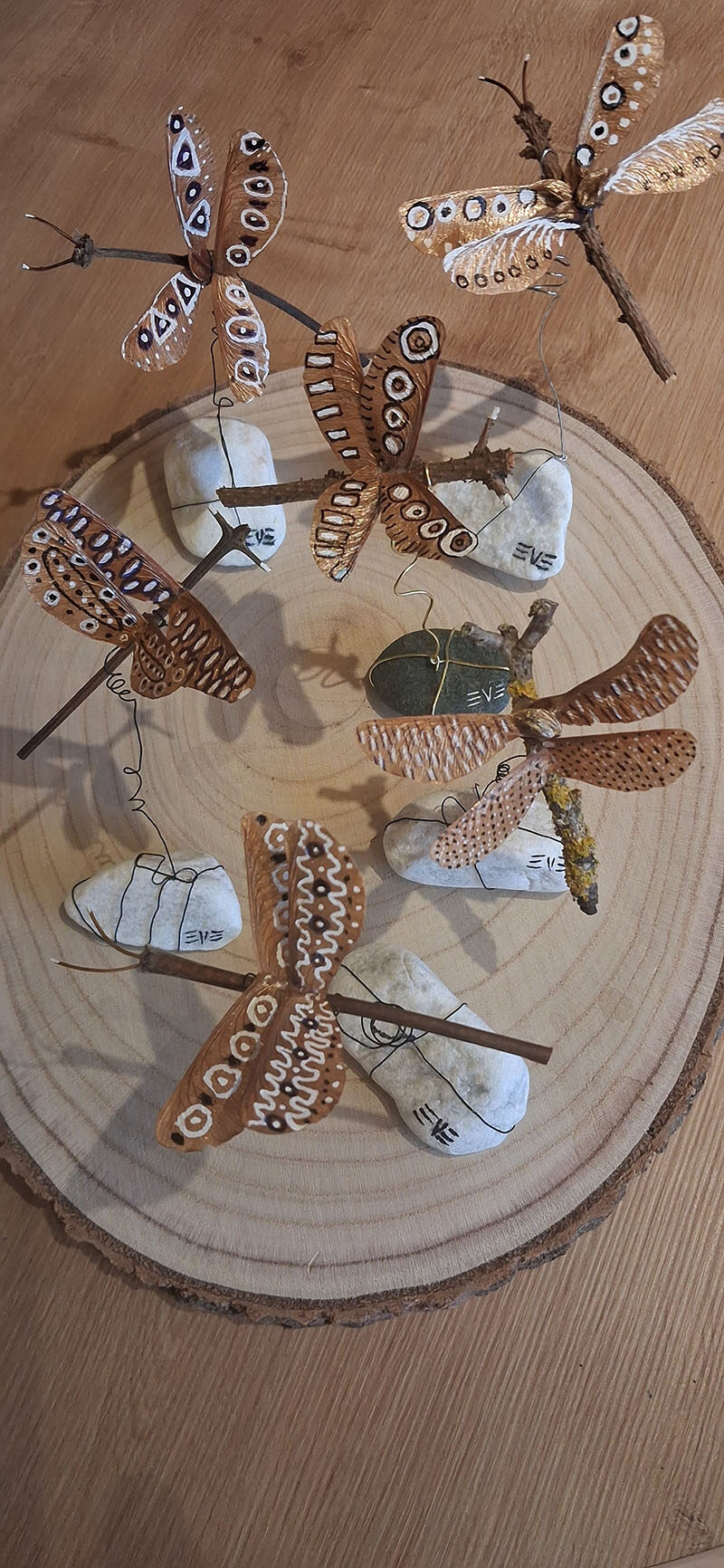 Grâce à ses changements permanents, la Nature m’offre une stimulation constante et c’est elle qui s’est imposée à mes œuvres : tableaux, cartes, insectes… Elle est, non seulement influente mais réellement présente dans chacune de mes nouvelles créations, comme ces samares (vous savez l’arbre qui donne des hélicoptères !) devenues libellules qui entrent dans ma dernière collection de coléoptères que les chercheurs du Museum d’Histoire Naturelle n’ont toujours pas réussi à identifier ! Ainsi, je suis devenue une « upcycling » ou « re-valorisatrice végétale !»