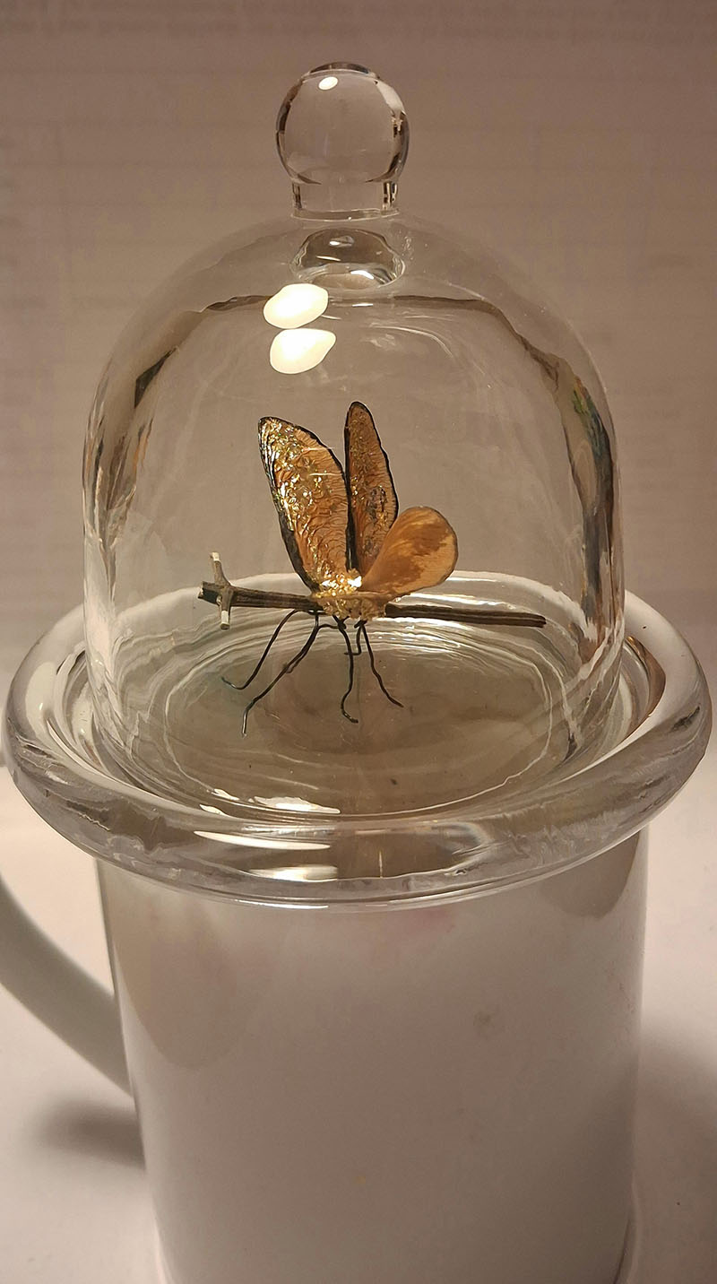 Grâce à ses changements permanents, la Nature m’offre une stimulation constante et c’est elle qui s’est imposée à mes œuvres : tableaux, cartes, insectes… Elle est, non seulement influente mais réellement présente dans chacune de mes nouvelles créations, comme ces samares (vous savez l’arbre qui donne des hélicoptères !) devenues libellules qui entrent dans ma dernière collection de coléoptères que les chercheurs du Museum d’Histoire Naturelle n’ont toujours pas réussi à identifier ! Ainsi, je suis devenue une « upcycling » ou « re-valorisatrice végétale !»