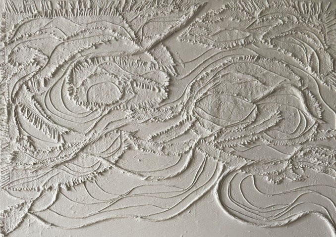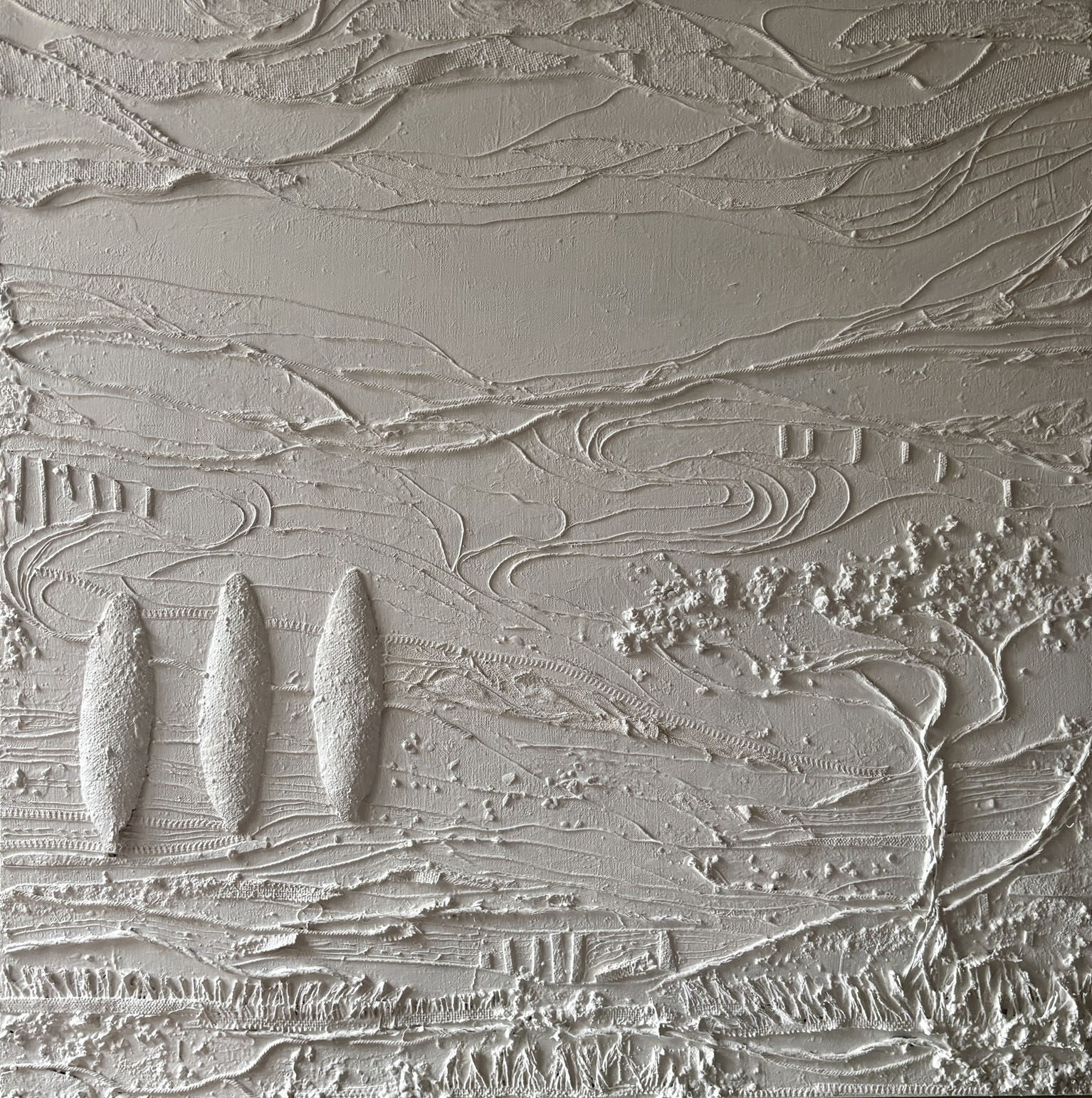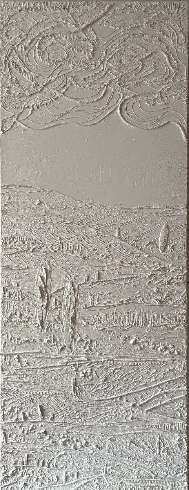 Dans ses paysages texturés, Lorence travaille le volume comme un relief sensible. Les matières naturelles sont sculptées, modelées et stratifiées afin de créer une topographie vibrante. La lumière accroche les aspérités, souligne les creux, révèle des lignes invisibles.