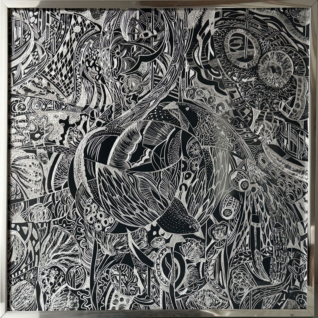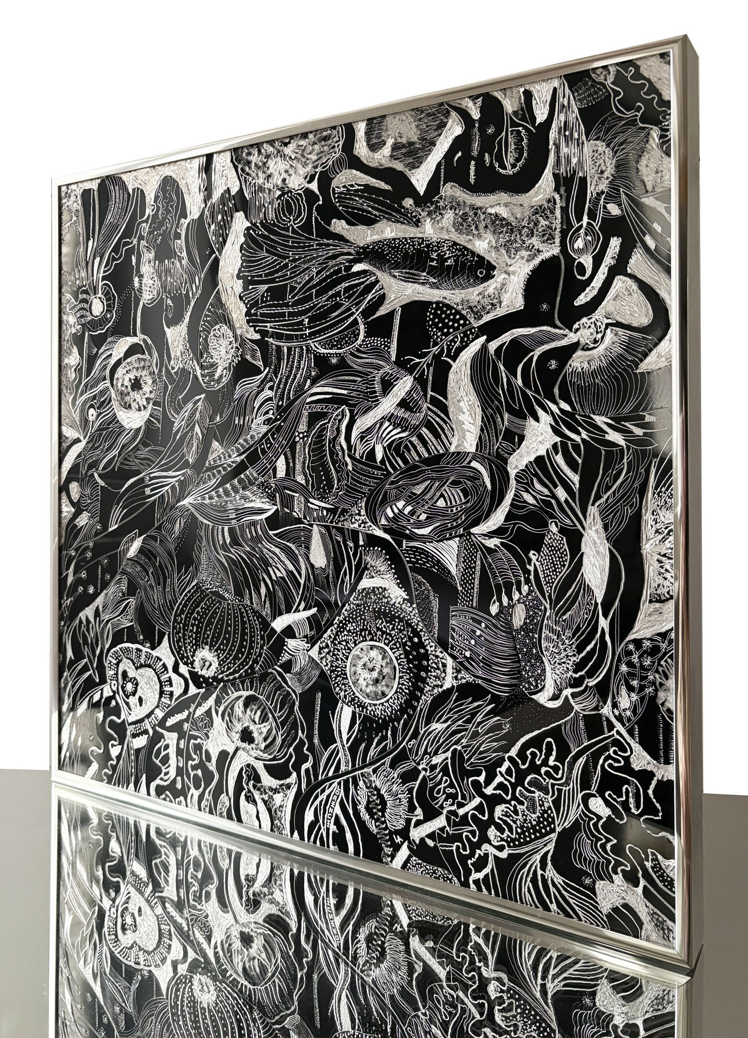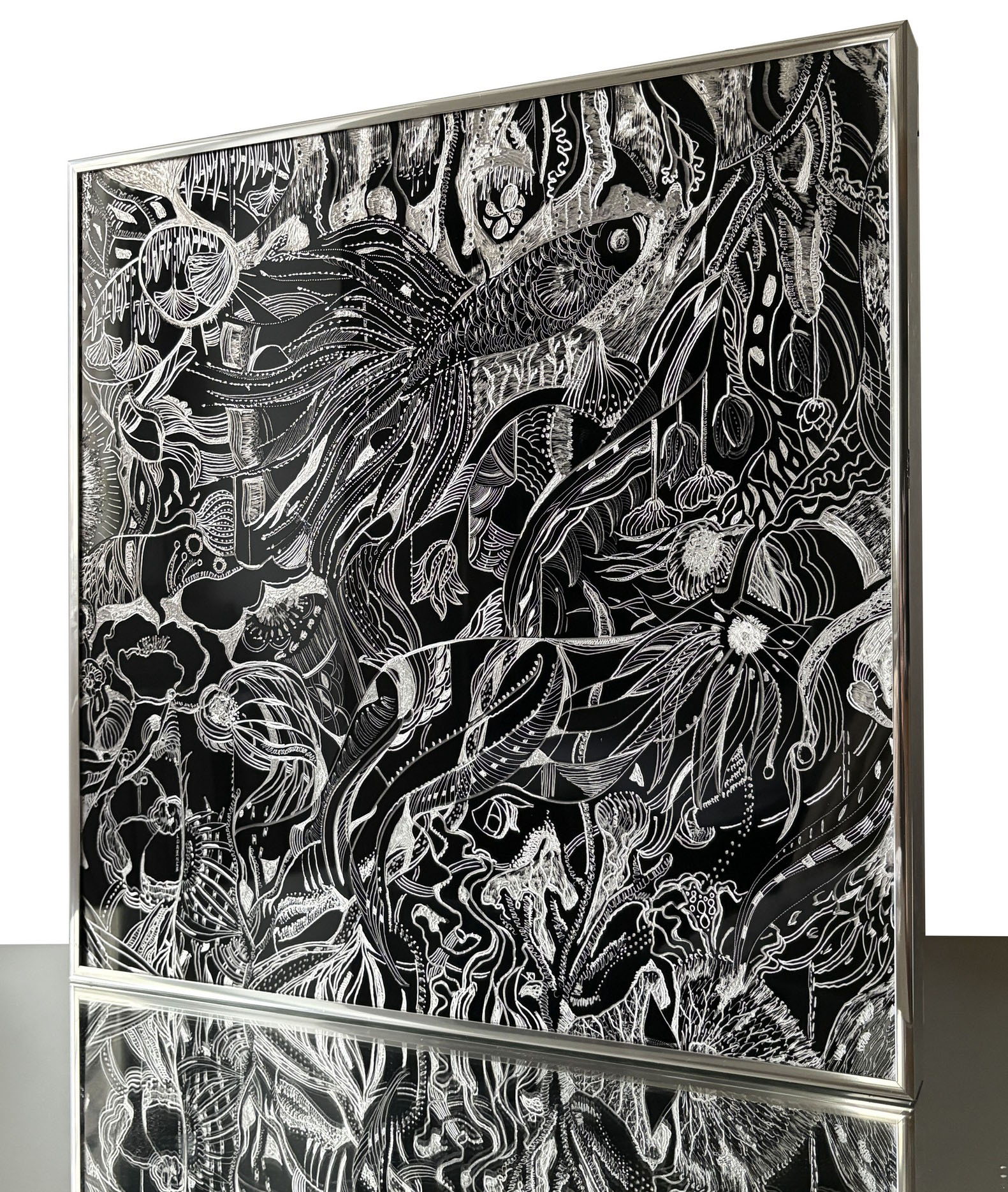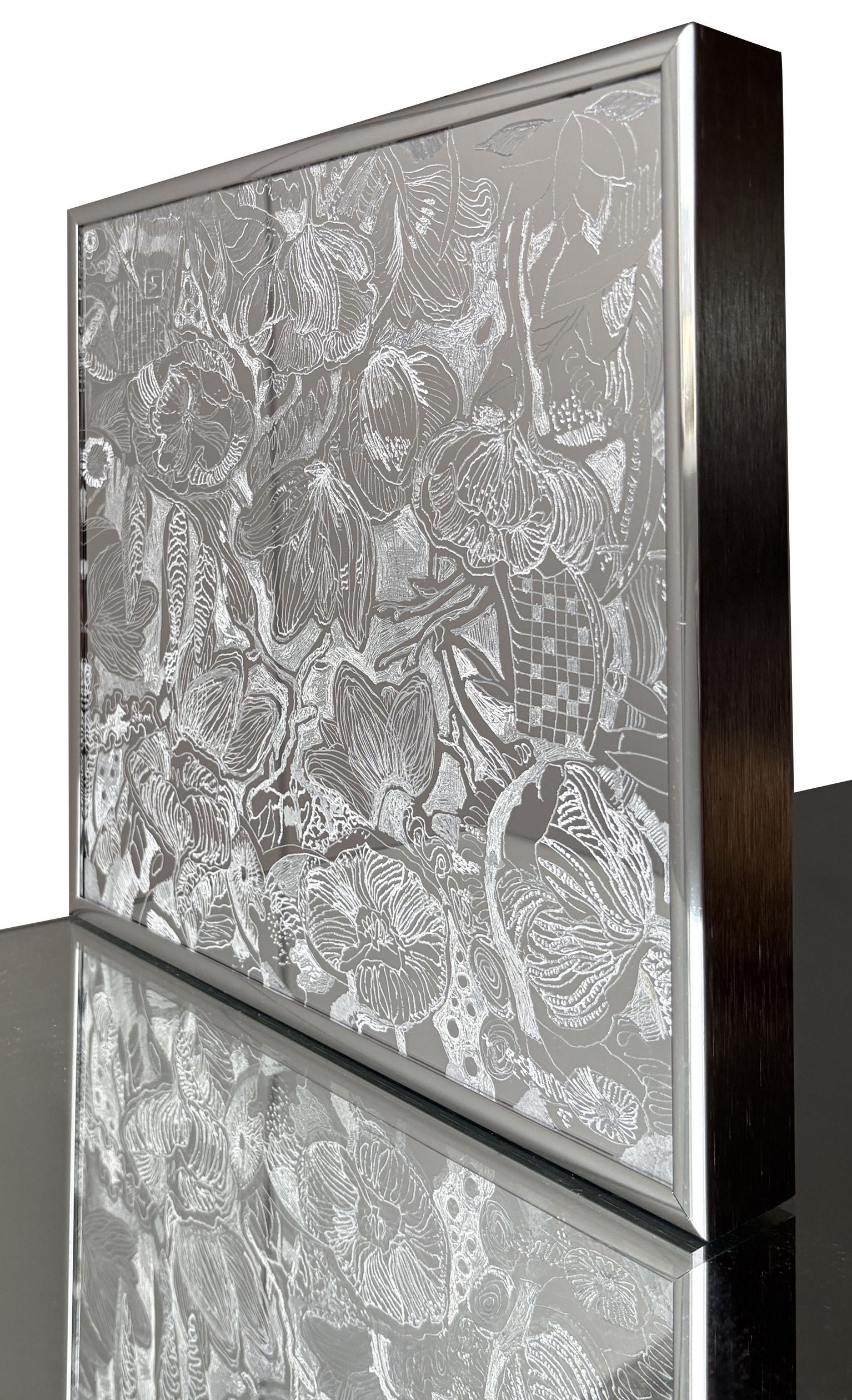 Elle transcende la matière extrêmement résistante pour en faire jaillir une oeuvre lumineuse unique aux facettes multiples et aux perspectives brillantes et changeantes.