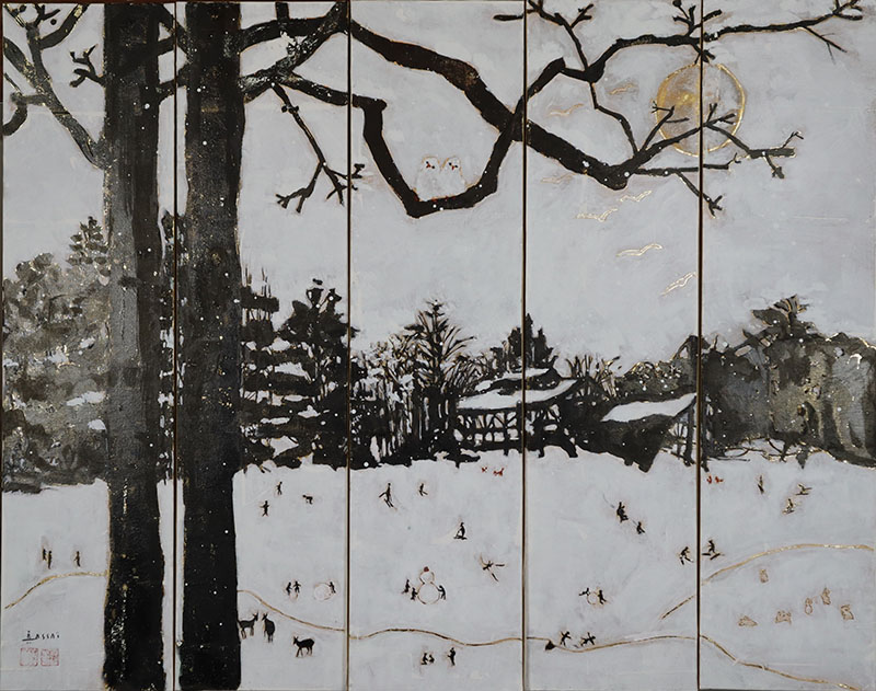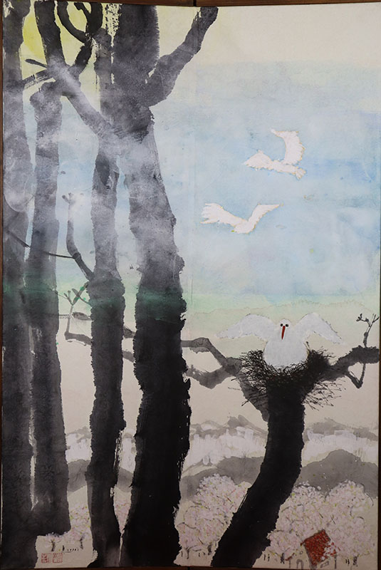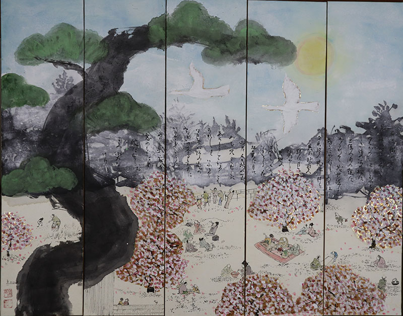 Comptant parmi les très rares calligraphes titulaires du 5e dan de professorat présents en Europe, elle est aussi passée maître dans l’art de l’aquarelle traditionnelle japonaise “Gansaï”. Pour cette technique ancestrale, elle prépare elle-même les pigments minéraux et végétaux au pilon, les mélangeant à de la colle de peau pour finalement les déposer au pinceau de martre sur d’extraordinaires papiers japonais marouflés sur toile.